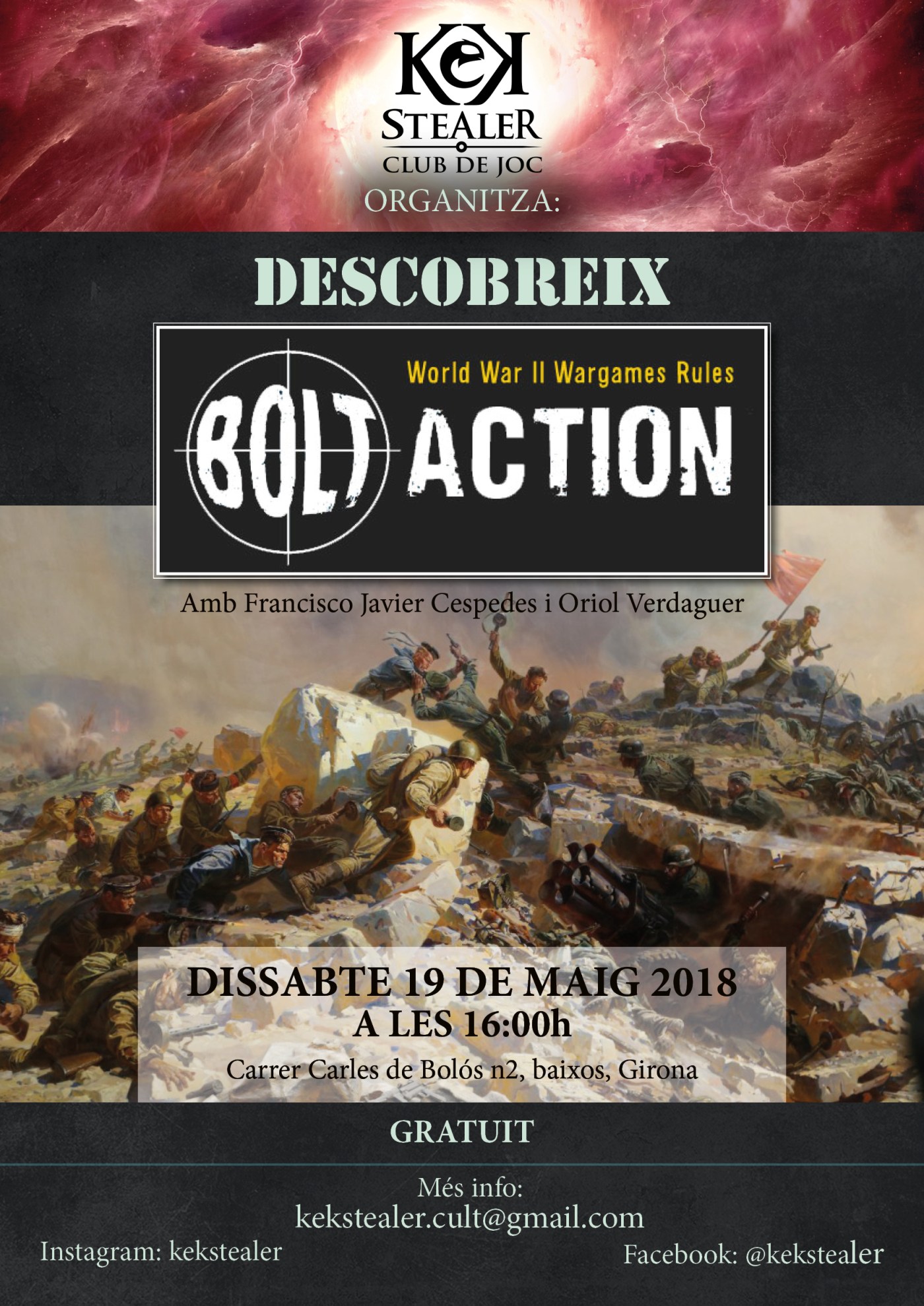 Descripció: Bolt Action és un joc de miniatures històric ambientat en la Segona Guerra Mundial, en escala 28mm. L’Oriol Verdaguer i en Francisco Javier Cespedes ens en faran una demostració explicant-nos els mecanismes del joc i com funcciona. No us ho perdeu!
