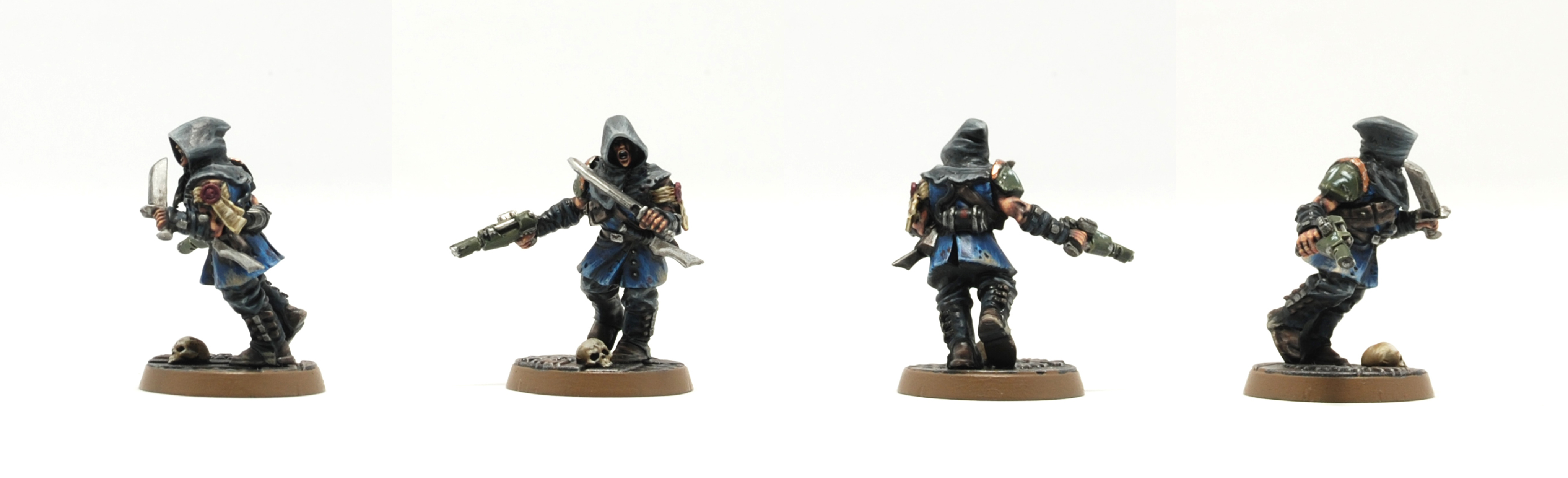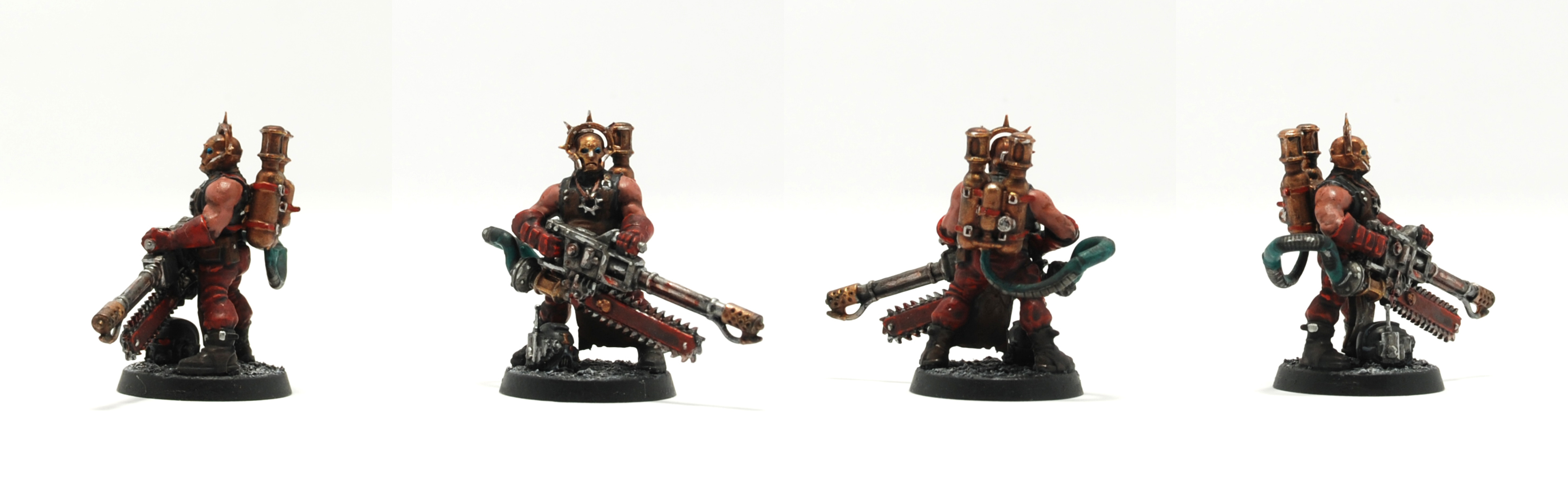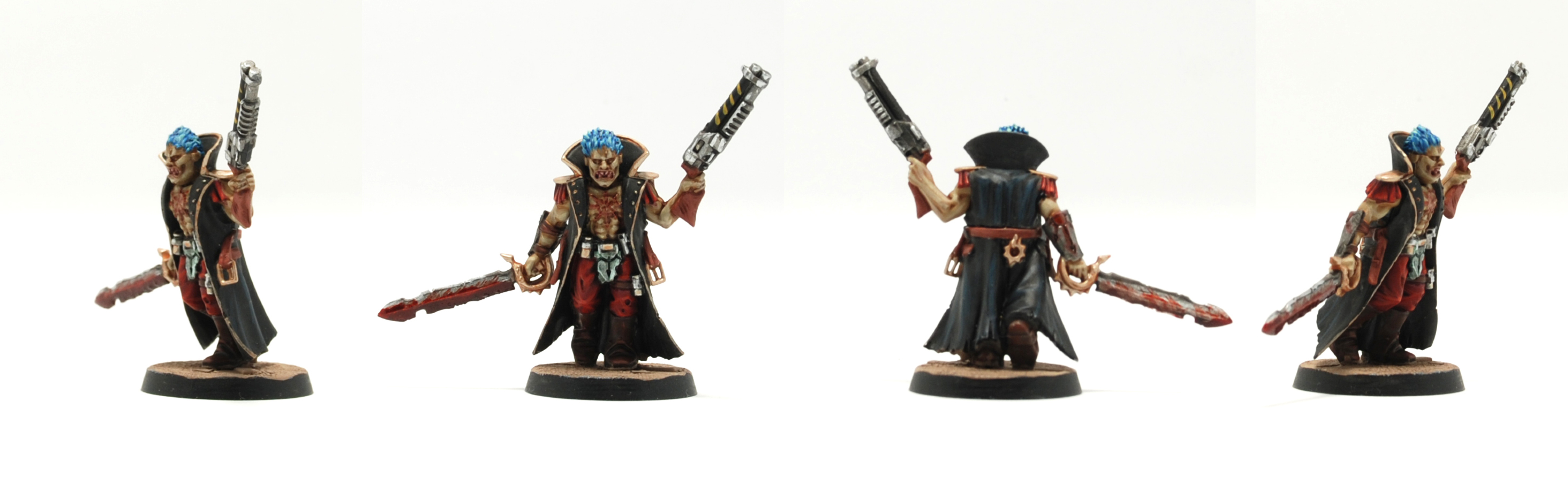 “2K” Ramírez era un Skitarii conocido como RM-Z 0002. Pasados unos años tras unirse al culto, se sometió a una operación para substituir los implantes cibernéticos que le servían como piernas por unas piernas reales de un pobre desgraciado imperial. También está convencido que es ambidiestro, por lo que lleva dos pistolas. También afirma poder disparar dos mil tiros por minuto, lo que le valió su apodo “2K”. Si meta es llegar a los cuarenta mil…