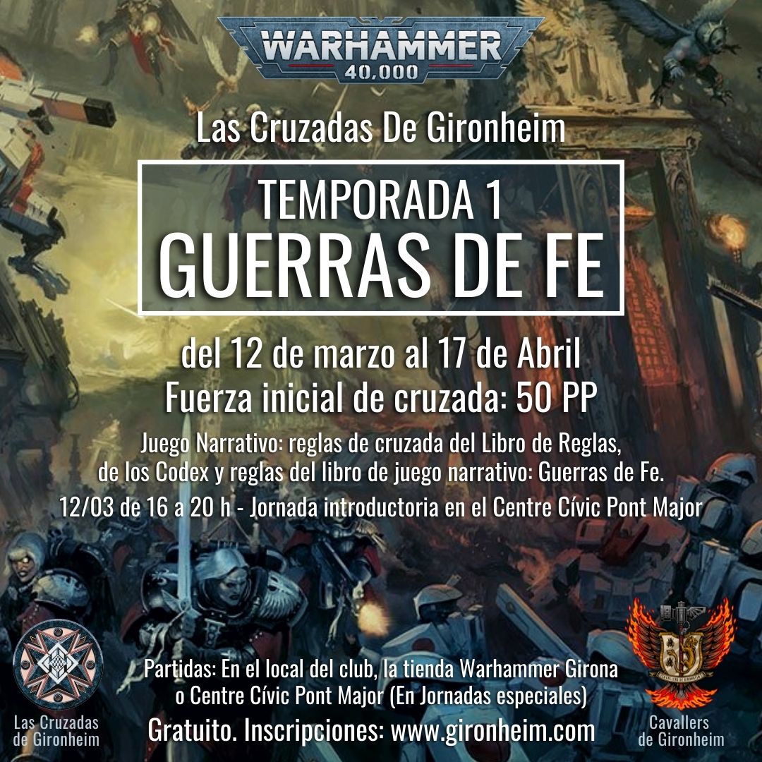 Esta primera cruzada empieza el 12 de Marzo y termina el 13 de Abril. Los jugadores pueden jugar en la tienda Warhammer de Girona o en el local del Club Caballeros de Gironheim. En ocasiones puntuales se habilitará un espacio en el Centre Cívic Pont Major. Se creará un grupo de whatsapp donde los jugadores de la cruzada podran quedar y buscar partidas (podrían jugarlas en otro lugar que los mencionados, aunque el objetivo sea tener un par de espacios comunes).