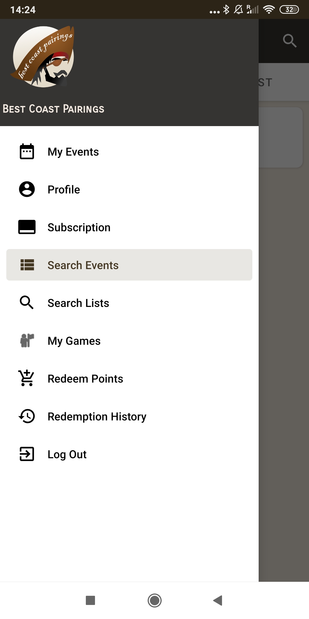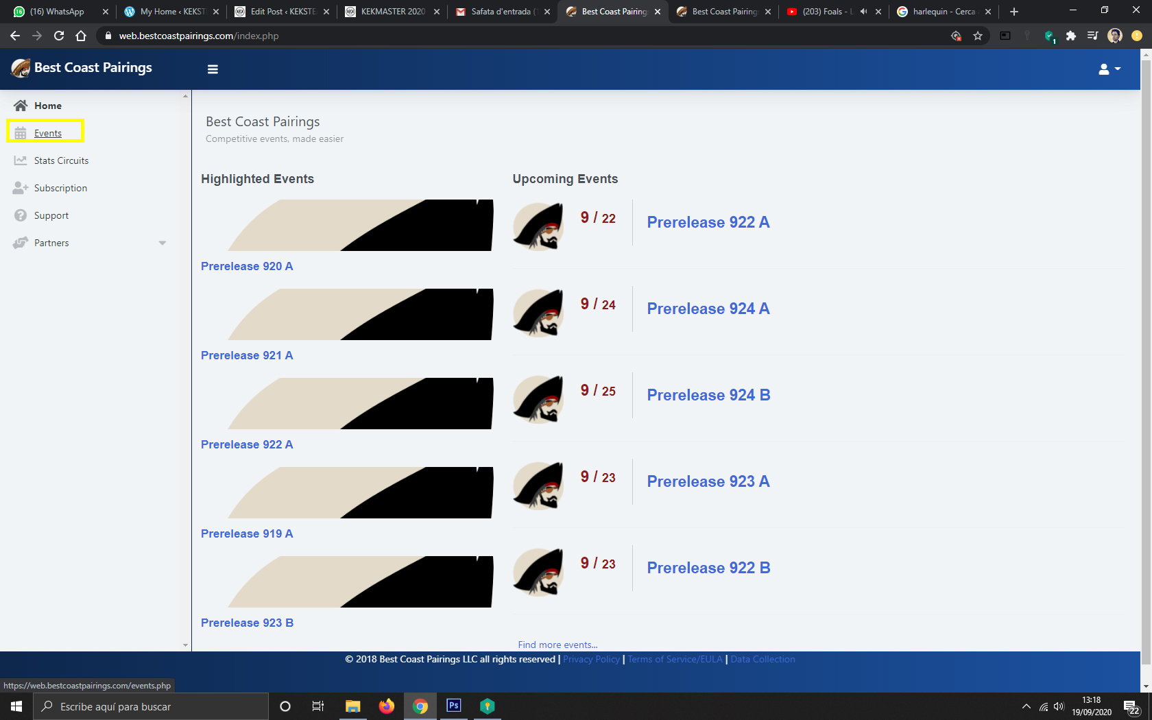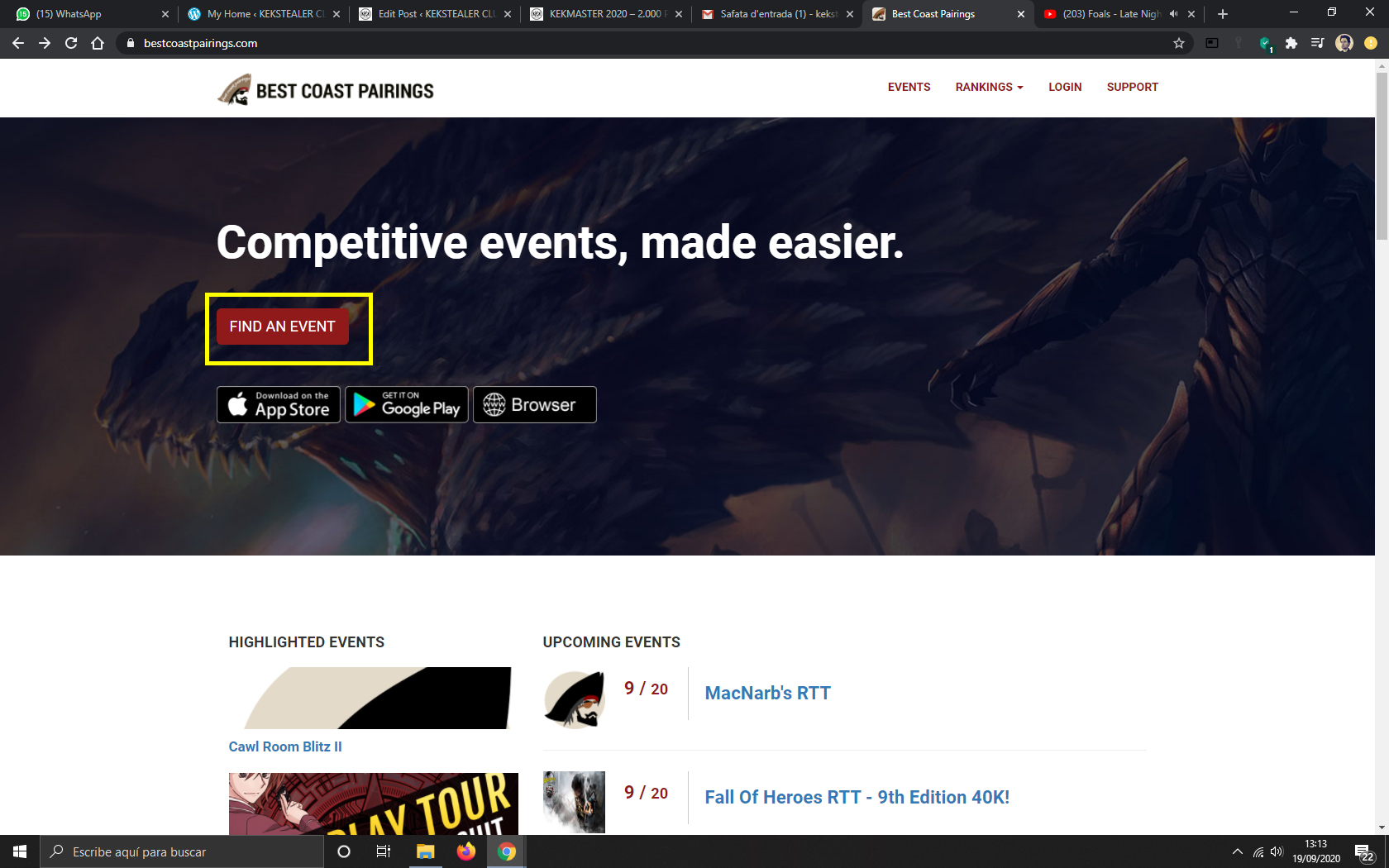 5. Volveremos a la pantalla Home. Hacemos clic en EVENTS. En la versión App tenemos un apartado con nuestros events, pero si no estamos apuntados deberemos buscarlo: SEARCH EVENTS.