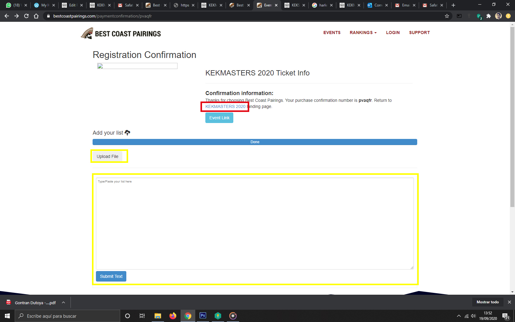 En todo caso, anotamos el número de registro que nos dan y muy importante, hacemos click en volver a la página para comprobar que aparecemos en el apartado inferior REGISTRED PLAYERS.
