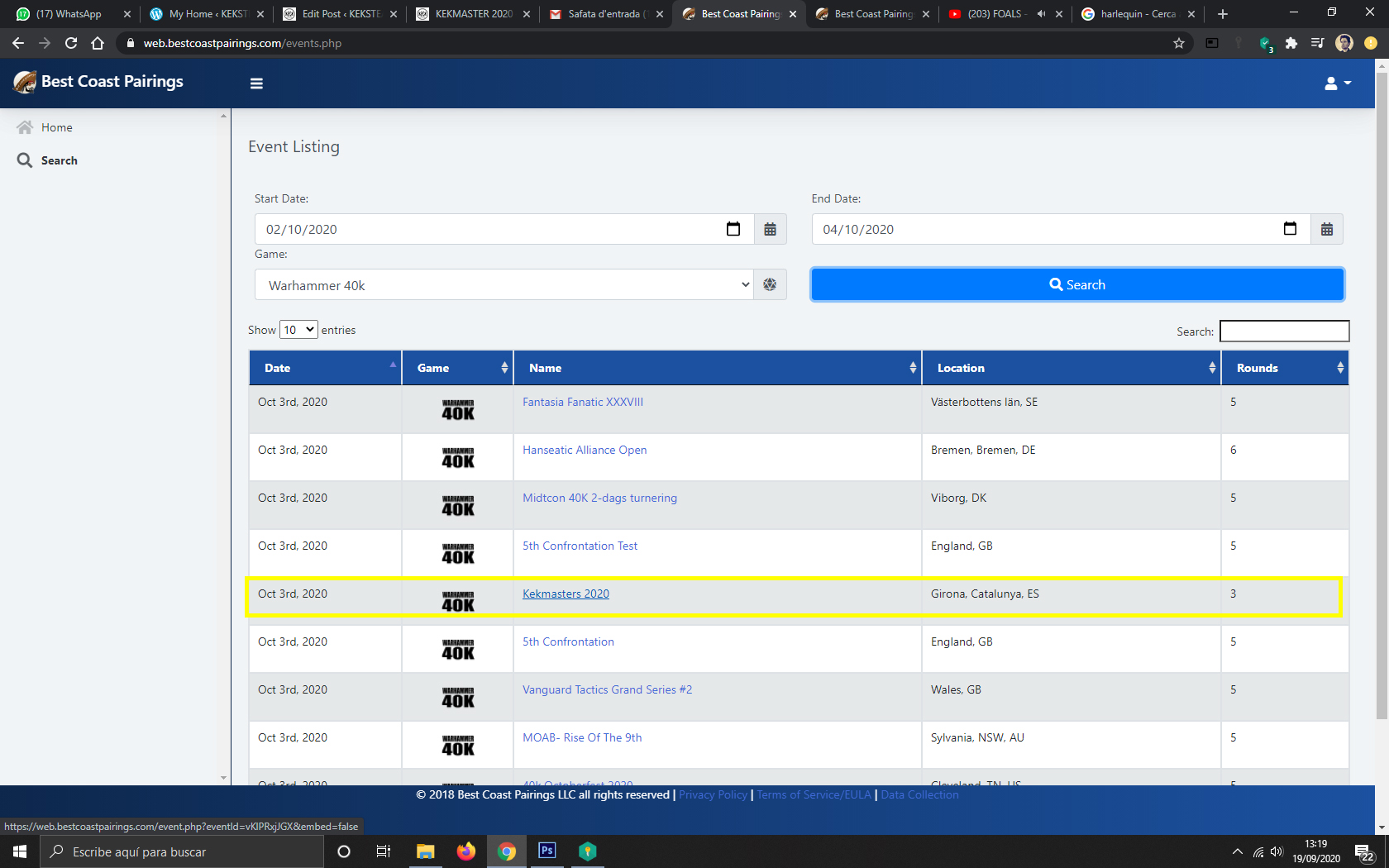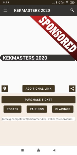7. Vemos que aparece un buen listado de torneos. En este caso seleccionamos el que nos importa, KEKMASTERS 2020. En la versión APP Seguramente será más fácil encontrarlo.