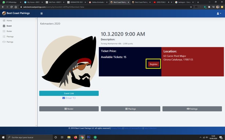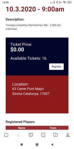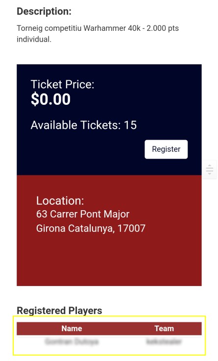 8. Entramos en la página del evento. Podemos ir al link para ver las bases con más detalle. En todo caso, hacemos click en REGISTRER para inscribirnos al Torneo. En la version APP hay una pantalla adicional. Deberemos hacer click a Purchase Ticket y nos conducirá a la misma página web en nuestro navegador. Si bajamos nos aparece la opción de registrar.
