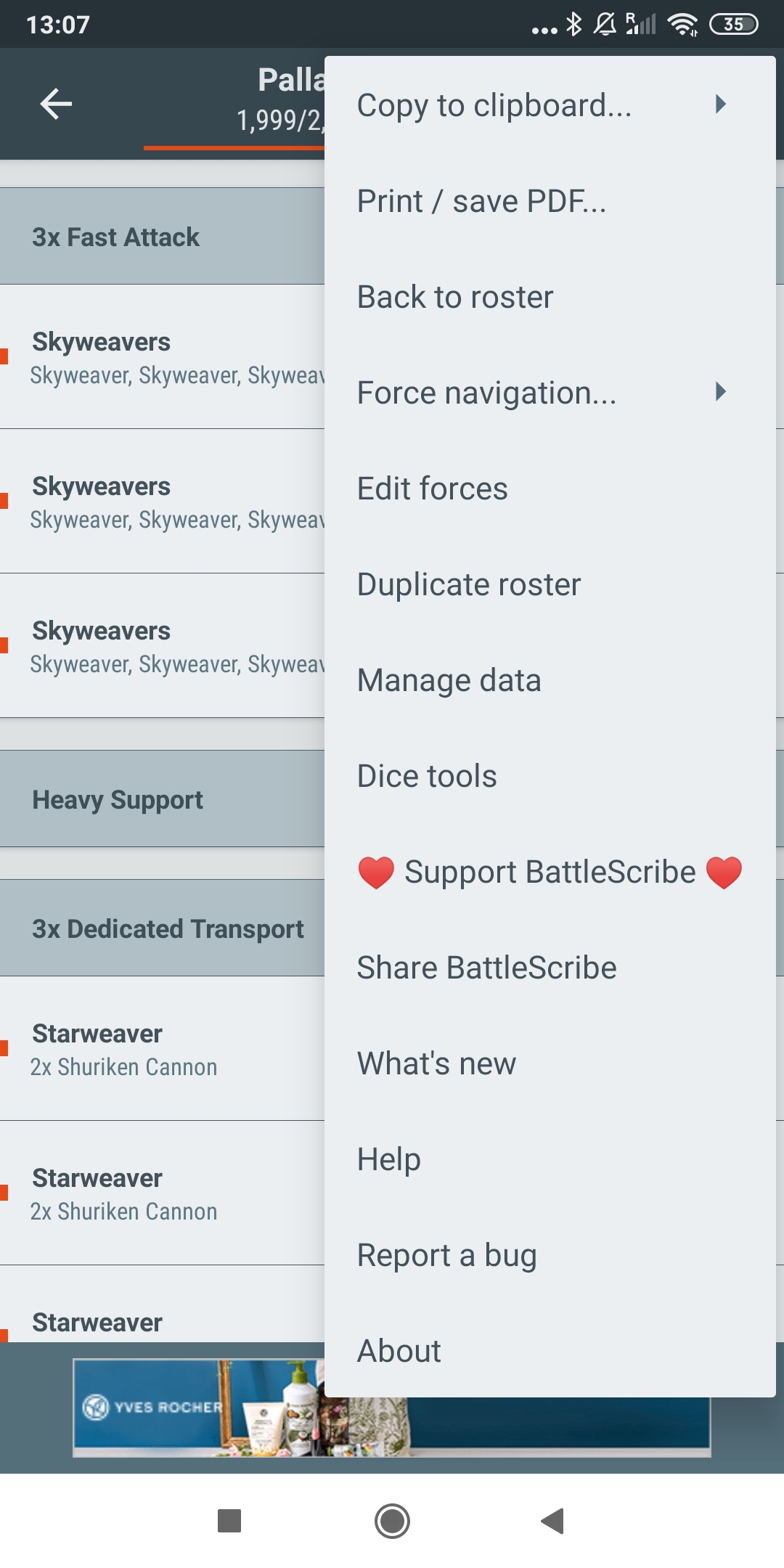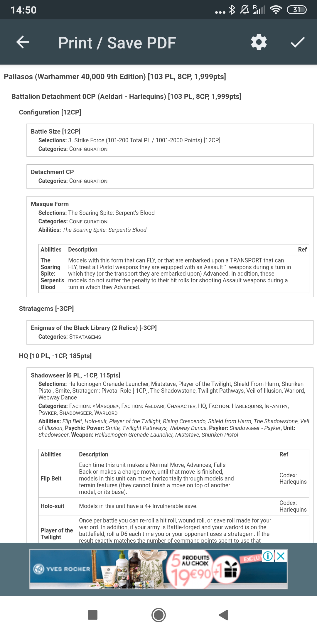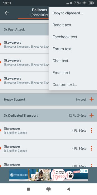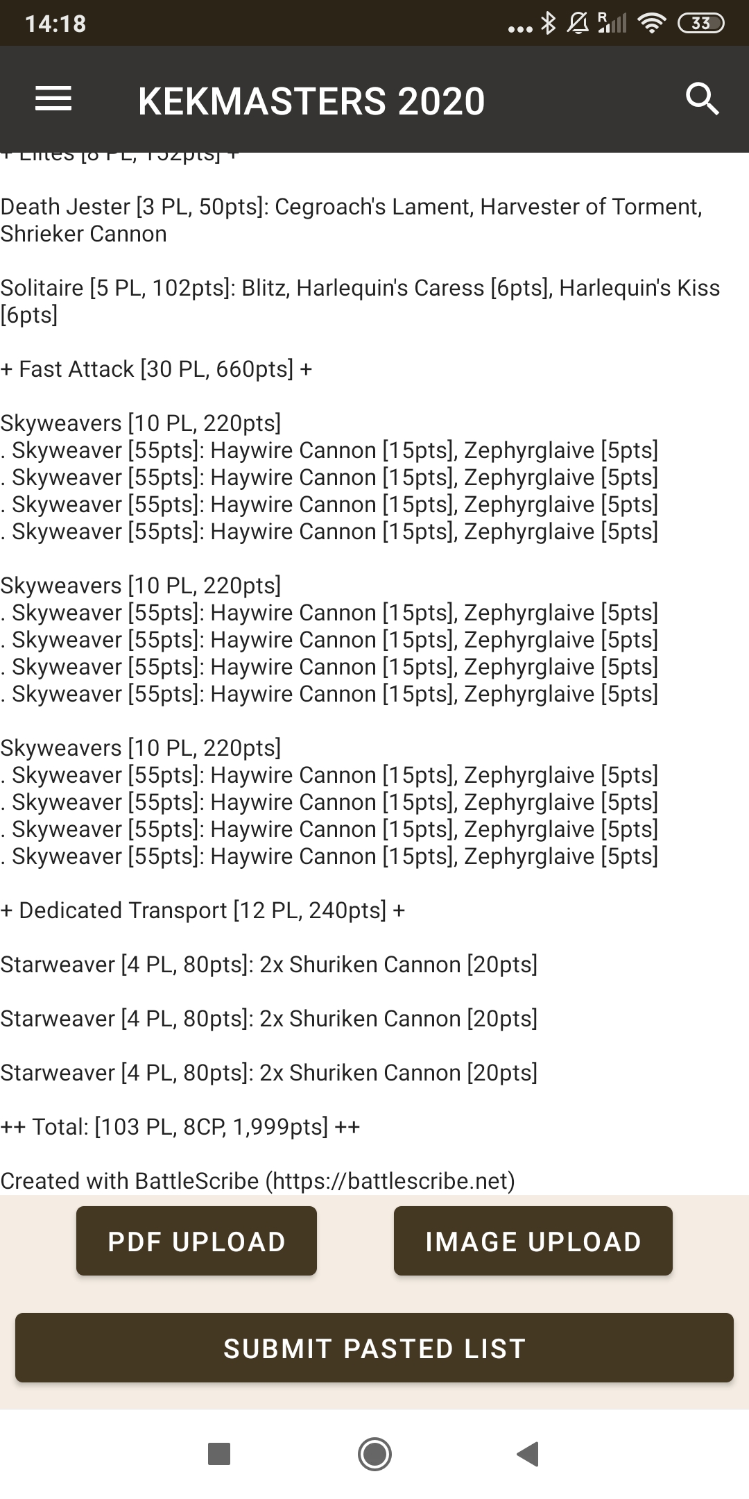 14. En este caso usamos Battlescribe. Podemos guardar la lista en PDF o pegarla directamente al espacio de texto de la pantalla del punto 13.