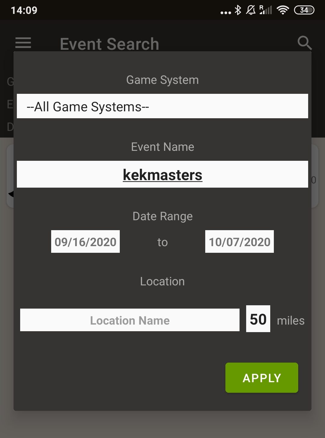 6. Aquí debemos seleccionar el juego. Si queremos acotar (aparecen todos los torneos del mundo en la versión web). Así que si tenéis claro la fecha, recomendamos poner en la fecha de inicio el día anterior y fecha final el día siguiente. En este caso al ser un torneo el 03/10 ponemos 02/10 y luego 04/10. Lo mismo ocurre en la versión APP pero allí podemos buscar por el nombre también.