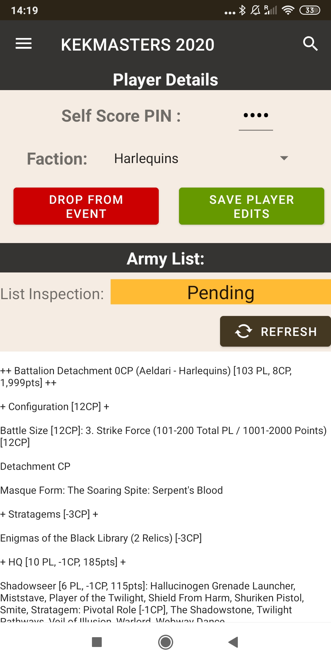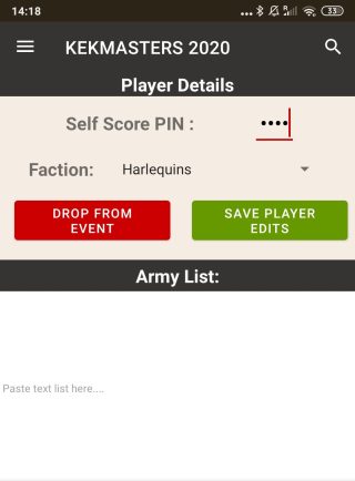 13. Aqui asignamos un PIN de 4 cifras que nos permitira anotar puntuaciones nosotros mismos (si el torneo lo permite). Y a continuación podemos entrar nuestra facción. El siguiente paso es añadir la lista (los organizadores podrían perdirlo por otros canales).