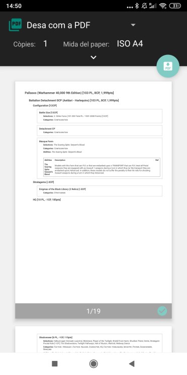 - Para PDF ponemos Print / save PDF. Nos saldrá una pantalla con opciones (el engranaje, podemos por ejemplo no poner todas las reglas, etc…), si nos parece bien le damos al OK. Luego nos sale una pantalla de previsualización. Le damos al boton verde con el icono del pdf. Nos pedirá destino donde guardarlo y nombre. Ya tenemos nuestra lista en PDF. Luego volvemos a la app, vamos a bajo de la pantalla del punto 13 y ponemos PDF upload.